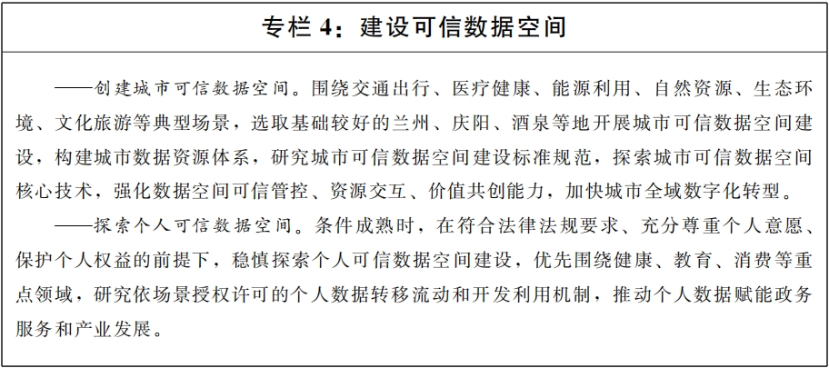 (十一)建設(shè)公共數(shù)據(jù)流通利用基礎(chǔ)設(shè)施。根據(jù)國(guó)家政策文件規(guī)定,探索城市、個(gè)人等可信數(shù)據(jù)空間建設(shè),鼓勵(lì)建設(shè)數(shù)聯(lián)網(wǎng)、數(shù)據(jù)元件等數(shù)據(jù)流通基礎(chǔ)設(shè)施,促進(jìn)數(shù)據(jù)高效便利可信流通。圍繞工業(yè)制造、現(xiàn)代農(nóng)業(yè)、醫(yī)療健康、綠色低碳等重點(diǎn)行業(yè)領(lǐng)域,探索數(shù)據(jù)基礎(chǔ)設(shè)施技術(shù)路線試驗(yàn),為國(guó)家數(shù)據(jù)基礎(chǔ)設(shè)施建設(shè)貢獻(xiàn)“甘肅方案”。推動(dòng)省內(nèi)數(shù)據(jù)基礎(chǔ)設(shè)施規(guī)則、管理、標(biāo)準(zhǔn)相通相容,促進(jìn)跨區(qū)域跨層級(jí)設(shè)施互聯(lián)、能力互通,實(shí)現(xiàn)數(shù)據(jù)利用方式向共享匯聚和應(yīng)用服務(wù)能力并重的方向轉(zhuǎn)變。