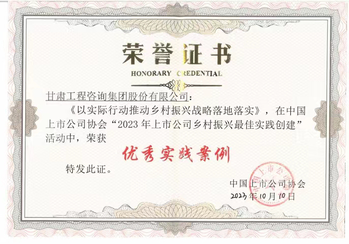 近日,在中國上市公司協(xié)會主辦的上市公司鄉(xiāng)村振興經(jīng)驗(yàn)交流會暨最佳實(shí)踐案例發(fā)布會上,由甘肅工程咨詢集團(tuán)申報的鄉(xiāng)村振興實(shí)施案例榮獲“優(yōu)秀實(shí)踐案例”。