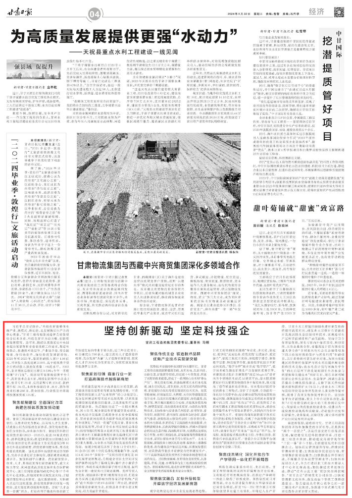 奮進新征程,建功新時代。甘肅工程咨詢集團將堅持和加強黨的全面領導,認真落實“兩個一以貫之”,以高質量黨建引領高質量發展,錨定建設先進科技創新體系、打造一流工程技術集團、推動建成高端咨詢智庫“三位一體”奮斗目標,全面建設現代科技創新企業。加快推進管理提升行動,持續深化管理標桿創建;加快推進價值創造行動,著力增強價值創造能力;加快推進品牌引領行動,不斷提升品牌運營管理水平;加快培養高層次人才,全力打造西北工程技術重要人才中心和創新高地;加快推進改革創新行動,推動“改革示范工程”更加突出科技屬性、“雙百企業”持續優化公司治理;加快完善創新文化體系,激發提振干部職工創新創造活力。努力建設具有核心競爭力的一流工程技術產業集團,為推進中國式現代化甘肅實踐作出新的更大貢獻。
