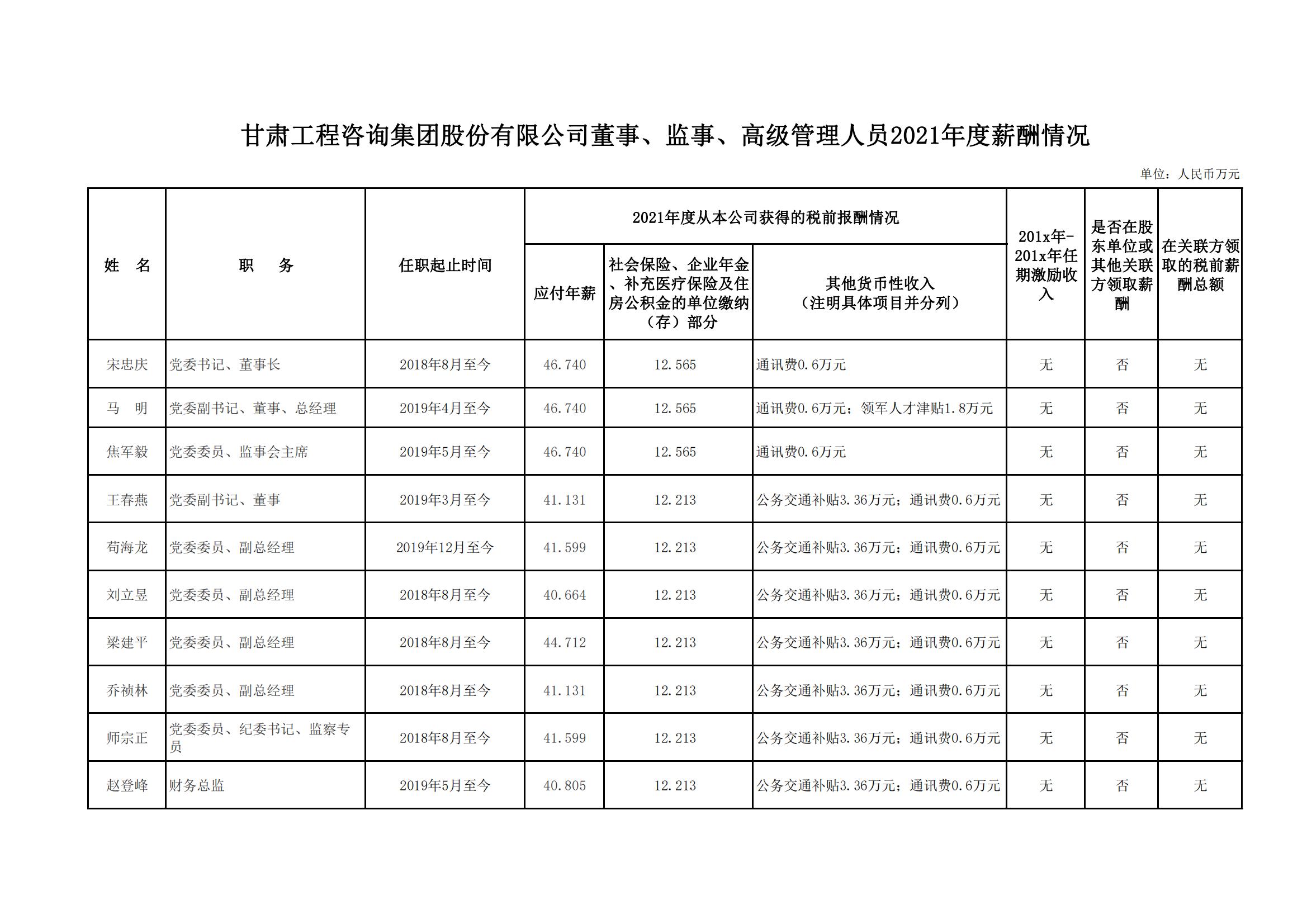 按照《關于印發甘肅省省屬國有企業負責人薪酬管理辦法的通知》(甘人社通〔2021〕310號)相關要求,現將甘肅工程咨詢集團股份有限公司負責人2021年度薪酬情況公示如下: