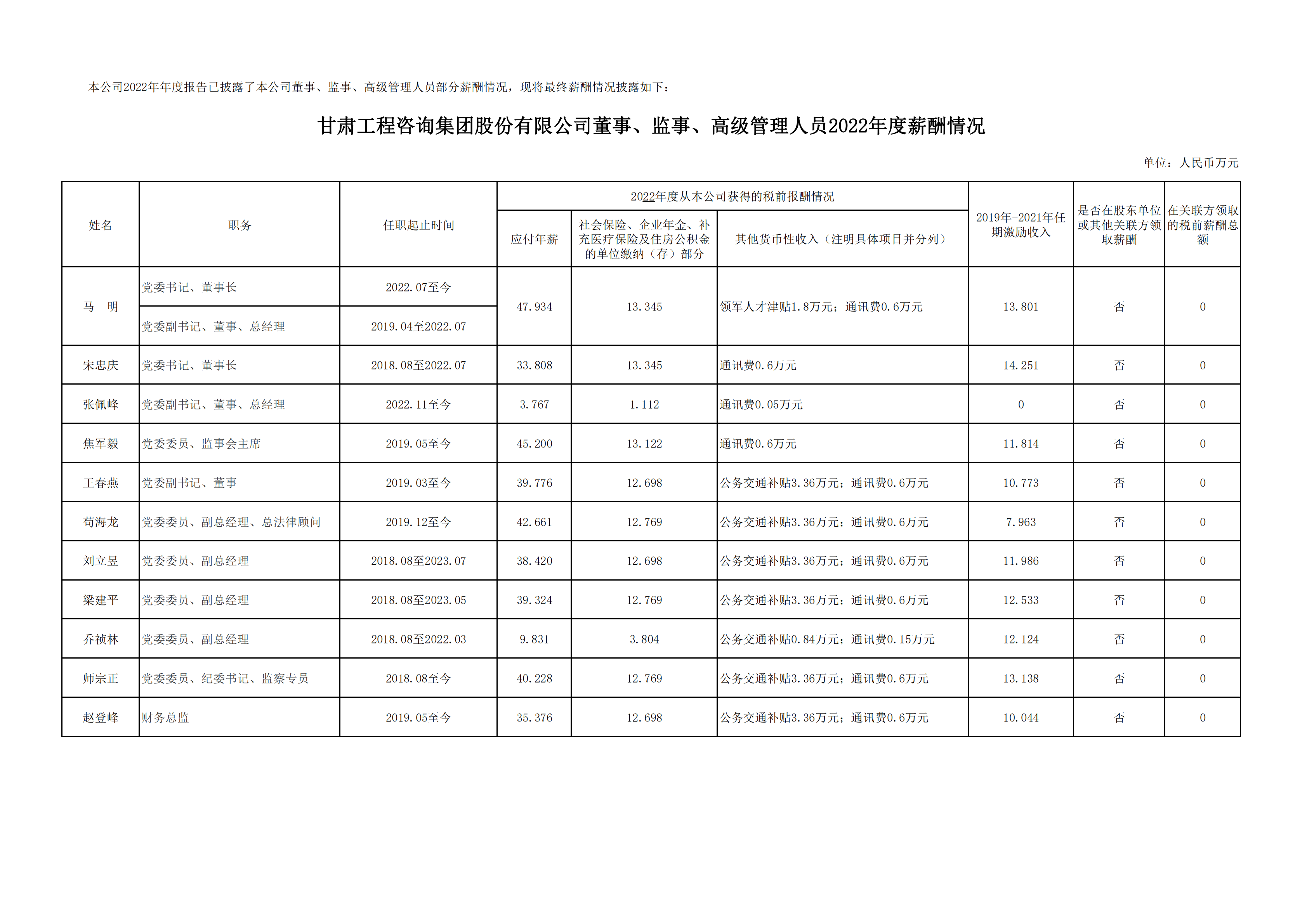 甘肅工程咨詢集團股份有限公司董事、監事、高級管理人員2022年度薪酬情況及甘肅工程咨詢集團股份有限公司工資分配情況