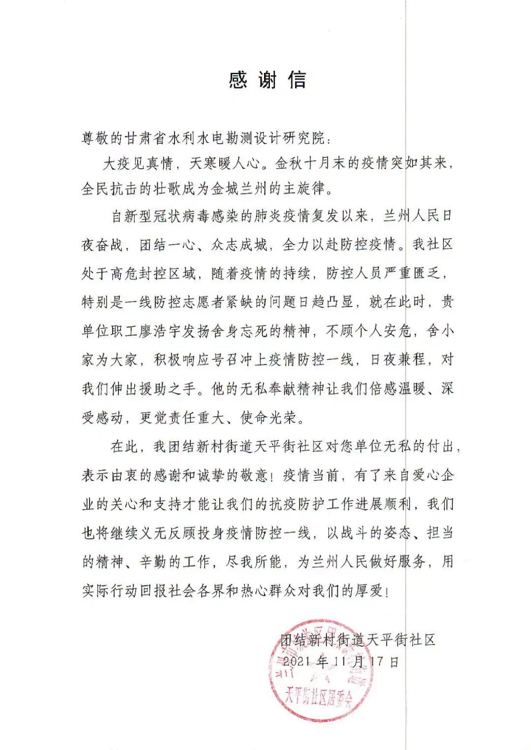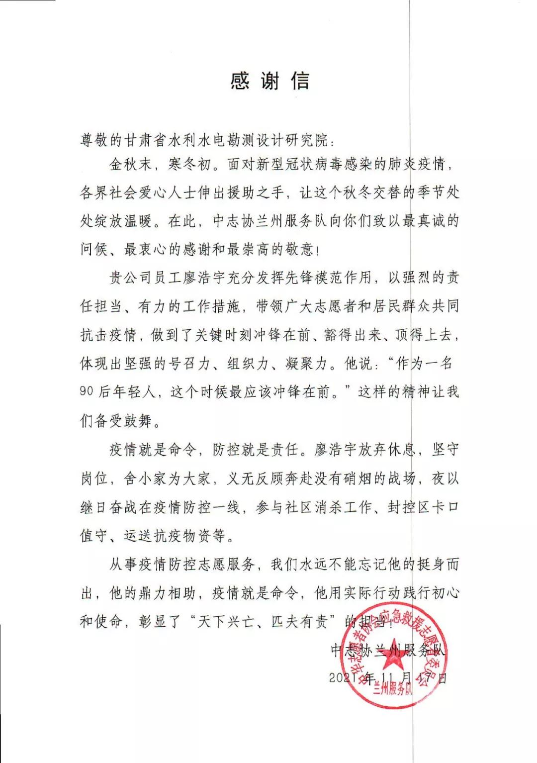 近日,水電設(shè)計(jì)院收到中志協(xié)蘭州服務(wù)隊(duì)和團(tuán)結(jié)新村街道天平街社區(qū)發(fā)來的感謝信。信中對水電設(shè)計(jì)院規(guī)劃院員工廖浩宇在此次疫情發(fā)生后,主動請纓參加疫情防控服務(wù)工作,甘當(dāng)疫情防控最美逆行者,持續(xù)堅(jiān)持26天志愿者服務(wù)的先進(jìn)事跡表示感謝。