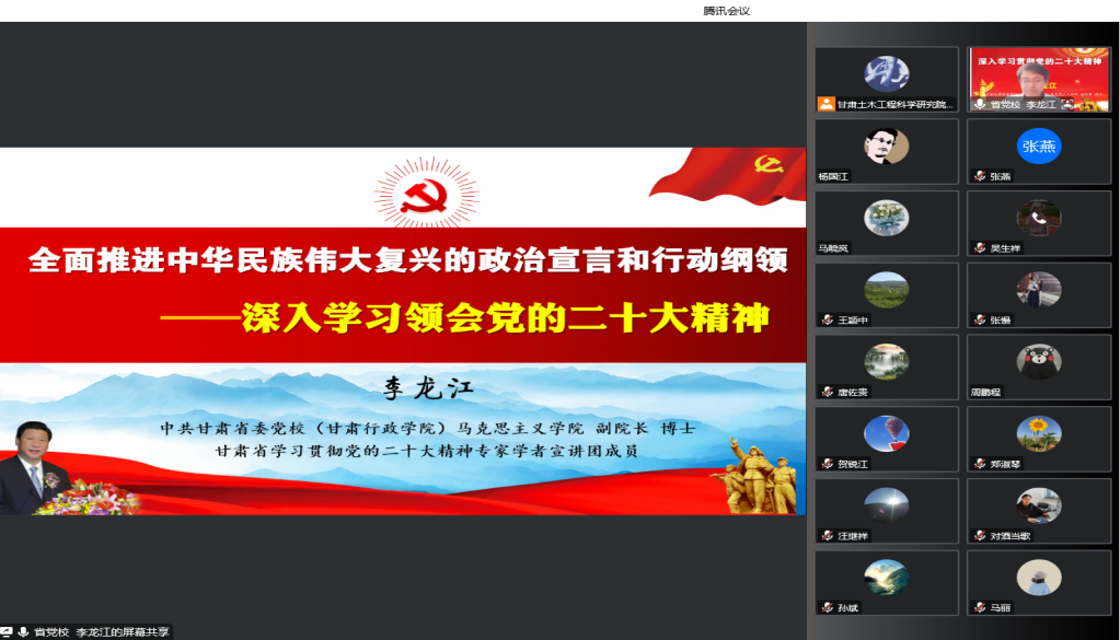 12月14日,甘肅土木工程科學(xué)研究院有限公司以視頻會議形式召開黨委理論學(xué)習(xí)中心組學(xué)習(xí)(擴大)會議暨黨的二十大精神專題培訓(xùn)輔導(dǎo)講座。黨委副書記、監(jiān)事會主席、工會主席張磊主持會議,領(lǐng)導(dǎo)班子成員、全體黨員、中層干部、入黨積極分子參加。