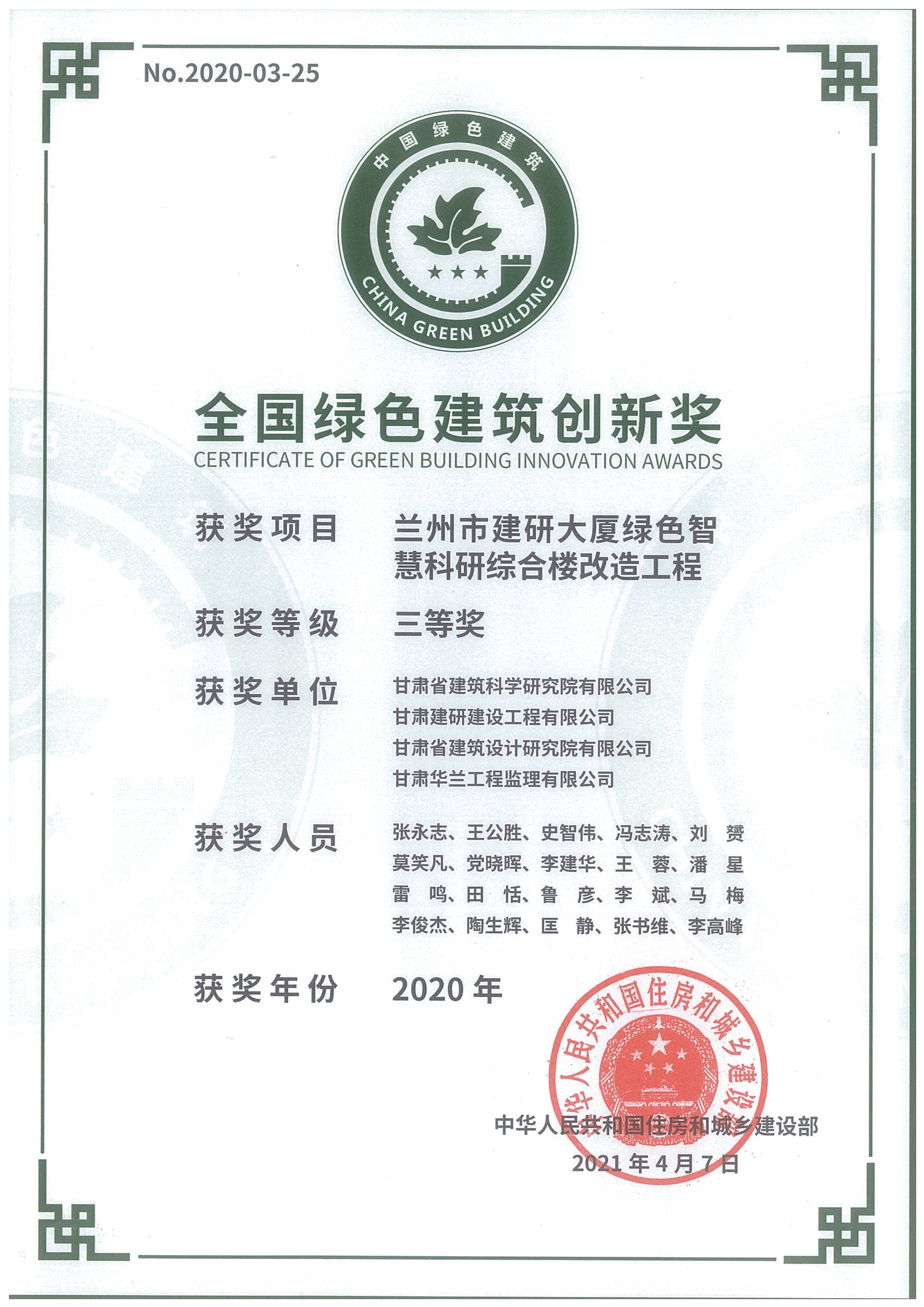 全國綠色建筑創(chuàng)新獎(蘭州市建研大廈綠色智慧科研綜合樓改造工程)